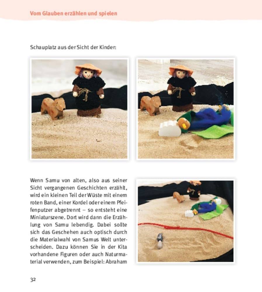 "Langsam lasse ich den Sand durch meine Finger rieseln." Während die Erzieherin Spielfiguren im Sand auf dem Boden bewegt, erzählt sie Bibelgeschichten, die in der Wüste spielen. Mit den Figuren Samu und Isa, dem kleinen Hirten und seinem Hund, erleben Kinder zwischen 1 und 6 Jahren das Alte Testament als spannende Abenteuer, in dem komplexe Themen wie Geburt, Freundschaft, aber auch von Trauer und Tod greifbar werden. In der anschließenden Freispielphase spielen sie nach, was sie gehört, gesehen und ertastet haben.