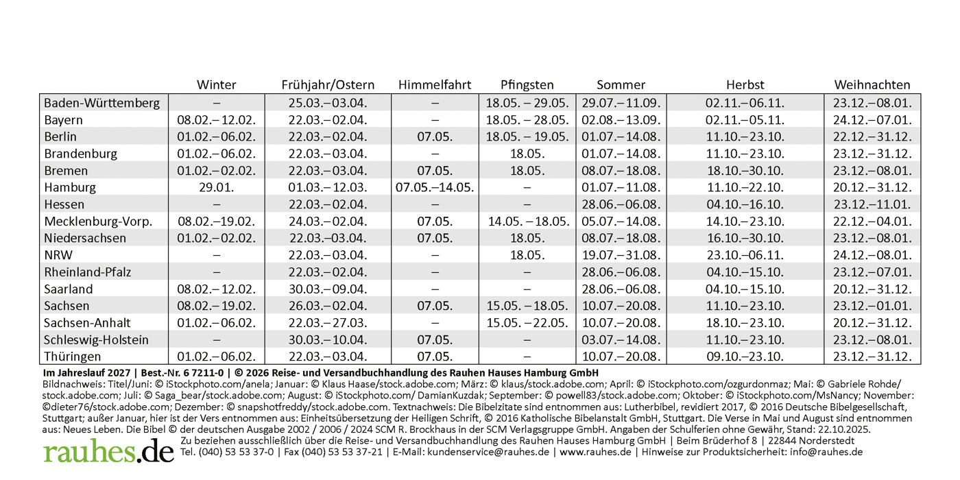 12 Kalenderblätter, 1 Blatt Schulferien, Kalender doppelt geheftet, mit Fälzelband, Perforation und Aufsteller