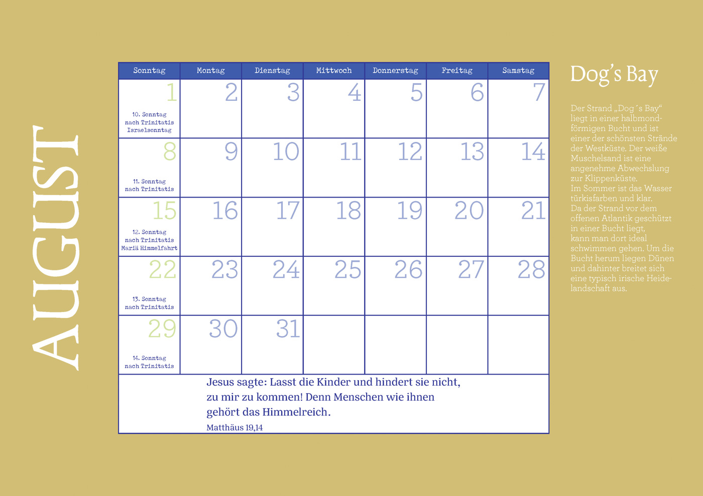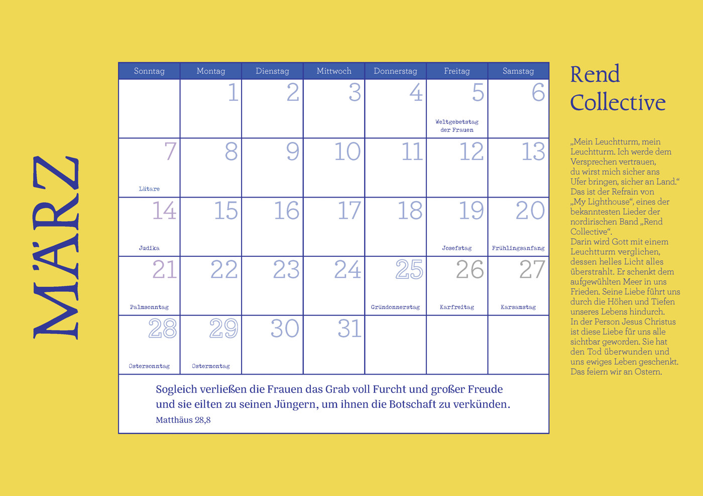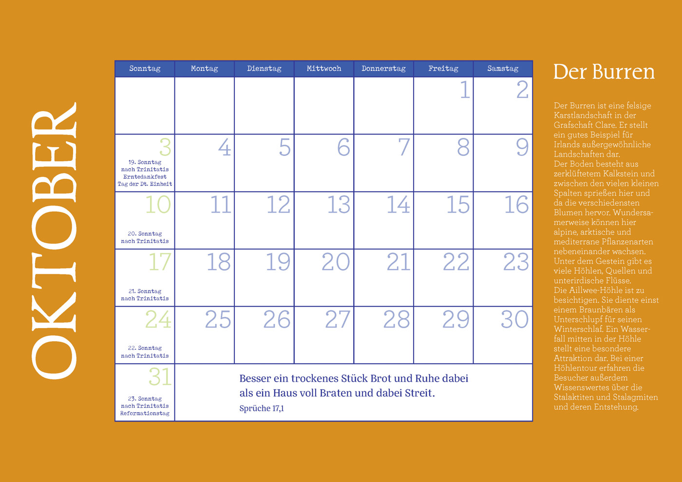 Mit viel Platz für persönliche Notizen, allen kirchlichen Feiertagen und den Monatssprüchen der Öku-menischen Arbeitsgemeinschaft für Bibellesen wird dieser Kalender zu einem praktischen und zugleich inspirierenden Wegweiser durchs Jahr.
