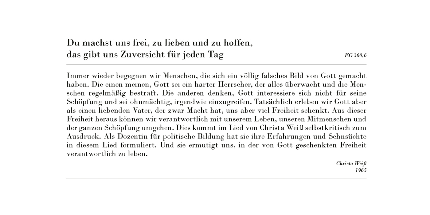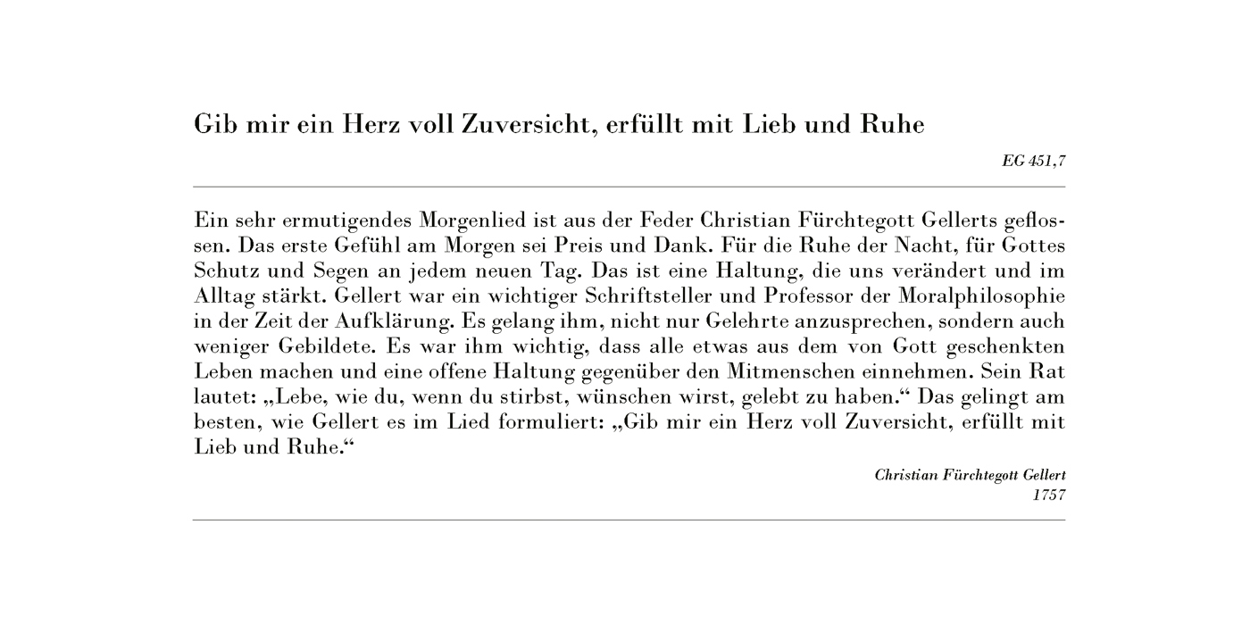 Angelehnt an die Jahreslosung 2027 schenkt unser beliebter Kalender mit ausgewählten Liedern aus dem Evangelischen Gesangbuch Zuversicht, Freude und Geborgenheit – gerade in herausfordernden Zeiten. Die Liedauswahl bietet echten Mehrwert: Auf den Rückseiten der zwölf Kalenderblätter finden sich jeden Monat einfühlsame Meditationen des bekannten Autors Ekkehard Graf zu Lieddichtern, Kirchenfesten und aktuellen Themen – informativ, ermutigend und alltagsnah.