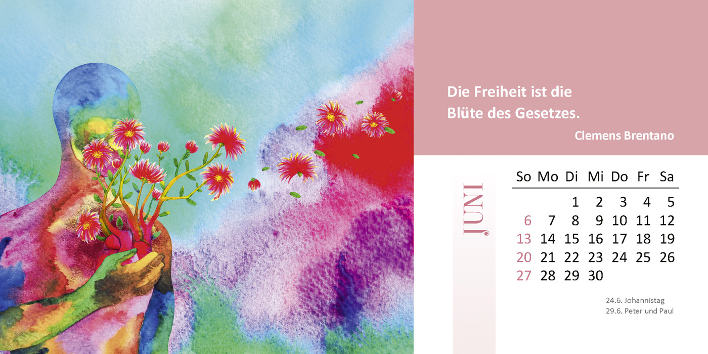Jeder Monat verführt mit einer farbenfrohen und ausdrucksstarken Illustration, die die Worte aufleuchten lassen und die Bedeutung von Freiheit, Mut und Gleichheit in den Alltag bringen. Ein außergewöhnlicher Kalender zum Verschenken oder für sich selbst. Jetzt entdecken!