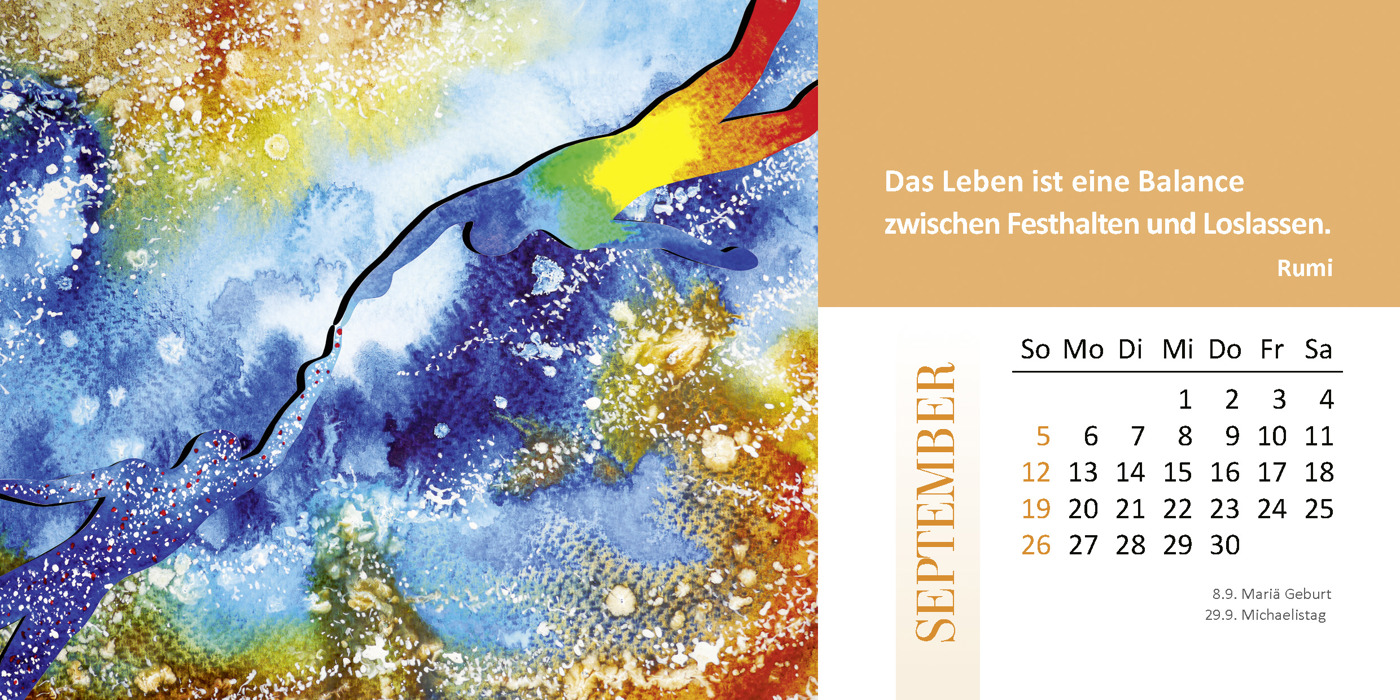 12 Kalenderblätter, 1 Blatt Schulferien, doppelt geheftet, mit Fälzelband, Perforation und Aufsteller.